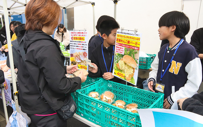 プレゼン大会で発表されたハンバーガー案をもとに、地元のスーパーサニーマートさんがつくったレンコダイのハンバーガーも販売されていました。