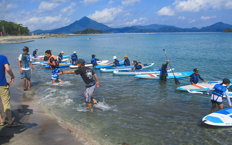 2日目はブルーフラッグ認証を取得している若狭和田ビーチでのSUP体験。最初はボードに乗ることも難しそうでしたが、すぐに慣れて、海の豊かさや楽しさを体感していました。