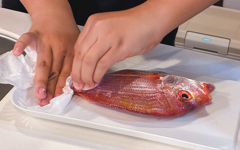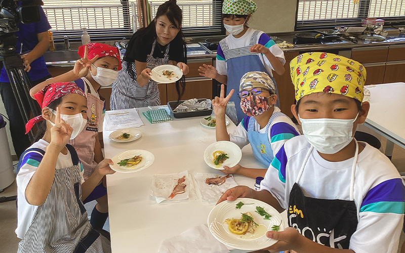 アクティビティを楽しんだ後は、レンコダイの調理体験です。レンコダイの3枚におろすところから挑戦し、見事「レンコダイの塩こうじレモンバターソース仕立て」を完成させました。