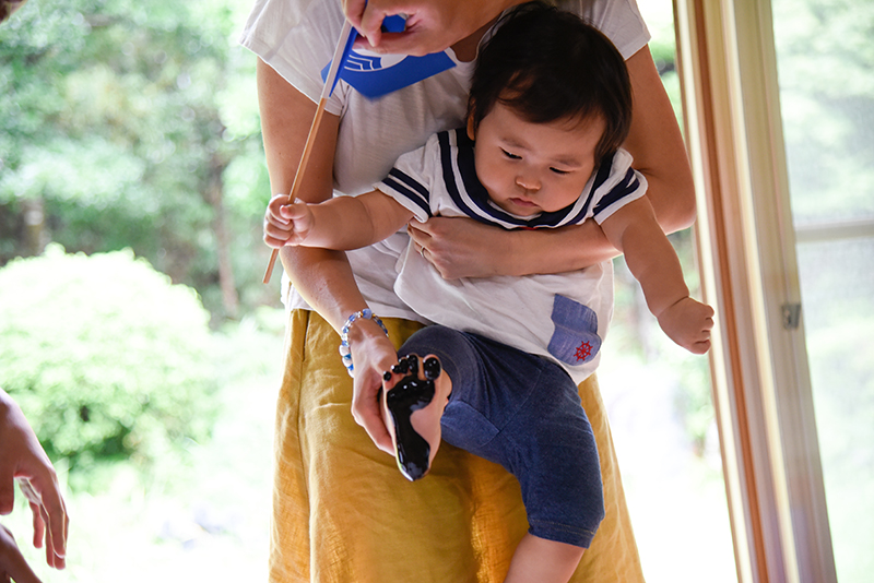 最後に、記念キーホルダーをつくるために足型をとります。赤ちゃんにとっては、ここが正念場。足の裏にインクをつける機会なんて、生まれてはじめての赤ちゃんも多いはずです。嫌がっちゃうかな?泣いちゃうかな?とドキドキしましたが、いえいえ、いらぬ心配でした。「え?ボク、なにされてるの?意味がわからない。」と言わんばかりにキョトンとしている赤ちゃん。「もう、好きにしたらええで。」といった感じでドーンと構えている赤ちゃん。「なにコレ、なにコレ、おもしろ~い。」と興奮ぎみな表情の赤ちゃん。みんな、みんな、本当に可愛かったです。頑張ってくれて、ありがとう。そして、足型をとった後、足についたインクがなかなかふき取れず、何人もの赤ちゃんを泣かせてしまったスタッフの不器用さを許してください。