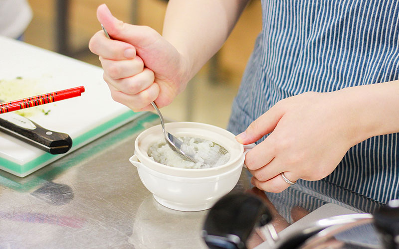 野菜やおかゆを、すりつぶしたり、裏ごししたり。出汁や白湯を加えながら、舌の上に乗せてゴクンと飲み込めるくらいまで、やわらかなペースト状にしていきます。
