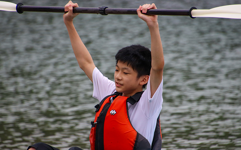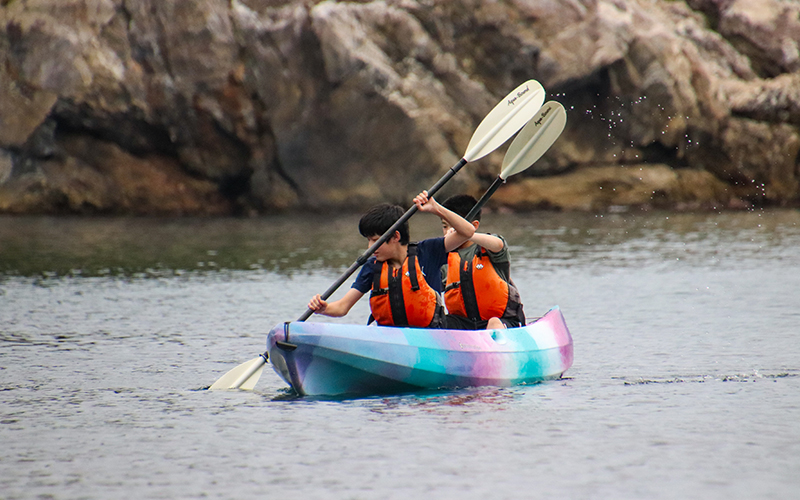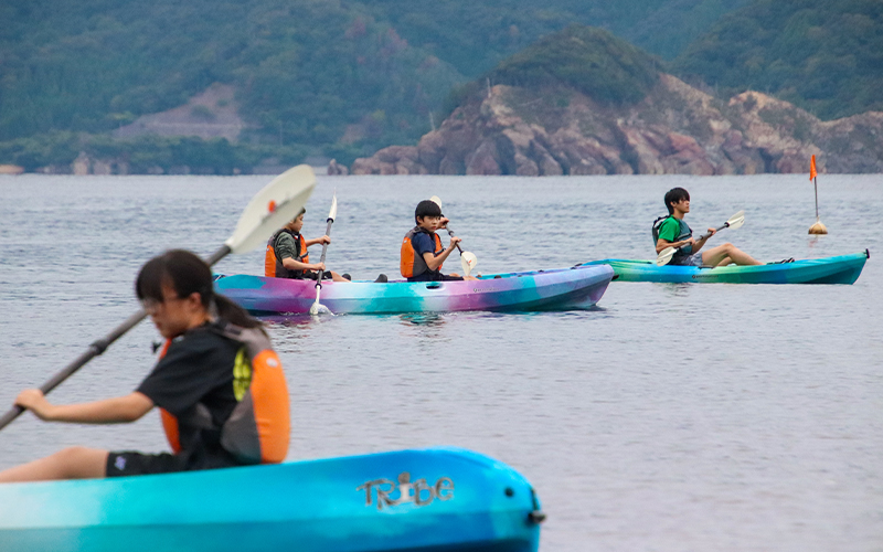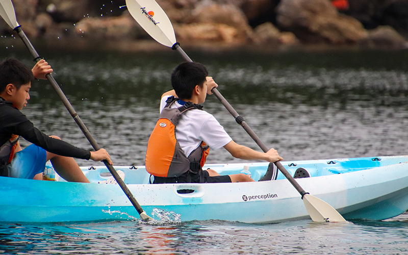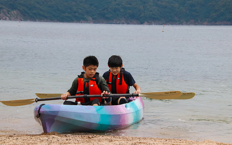 それぞれカヤックに乗り、パドルで漕いで海を進んでいきますが、生徒たちの掛け声は日本語ではなく「ライト」「レフト」でした。とても自然に英語を使っています。