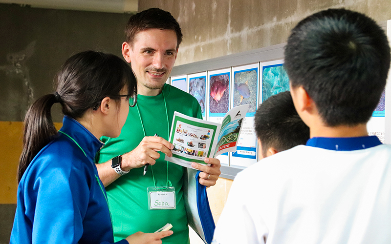 ALTは、シンプルな英単語とボディーランゲージを組み合わせて、磯釣り体験の説明をしていきます。さらに、写真やイラストなども効果的に使うなどの工夫も。生徒たちはしっかりALTの話を理解し、行動しています。