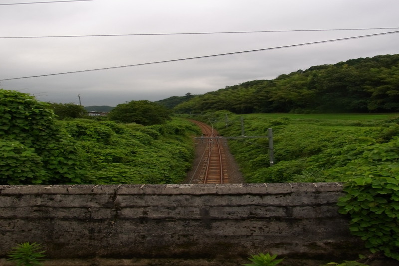 登山当日、天気はあいにくの曇り。夜に雨も降っていたので、登山道の状態はあまり良くないだろう。しかしテンションは下げずに、青葉産のオニギリを二人分用意して、高浜の友人に西側の登山口近くまで車で送ってもらった。登山口から1kmほどのところから2回目の登山開始。途中高浜町と舞鶴をつなぐ小浜線の水色の2両電車を見送り、松尾寺に到着。